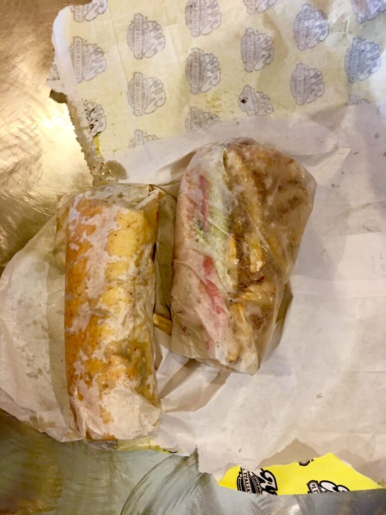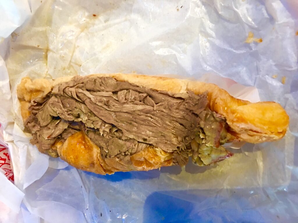 Zanim przejdę do opisów jedzenia jedna uwaga. Tych kanapek nie można ładnie sfotografować. Nie ma takiej opcji, jeśli nie zaproszą Was do kuchni i pozwolą zrobić zdjęcia przed zapakowaniem. Po prostu bułka napchana bardzo wilgotnym mięsem i namoczona sosem po zawinięciu w papier robi się płaska, ugnieciona. A zawijają ją mocno, bo lecą z niej soki. Więc nie przejmujcie się wyglądem, tutaj główną rolę gra smak doskonałej wołowiny.