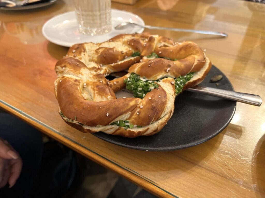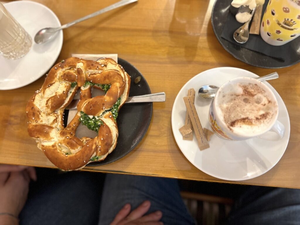My skorzystaliśmy z tej drugiej opcji. Kawy, herbaty i ciasta. Ale również świetny słony precel ze szczypiorkiem i serkiem. Baaardzo mi smakował.