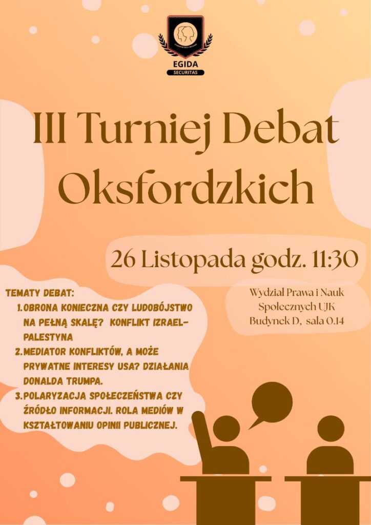 W środę 26 listopada o godzinie 11:30, na wydziale Prawa i Nauk Społecznych UJK, odbędzie się III Turniej Debat Oksfordzkich. Jest to inicjatywa SKN ,,Egida Securitas”. Na uczestników czeka wiele trudnych tematów.