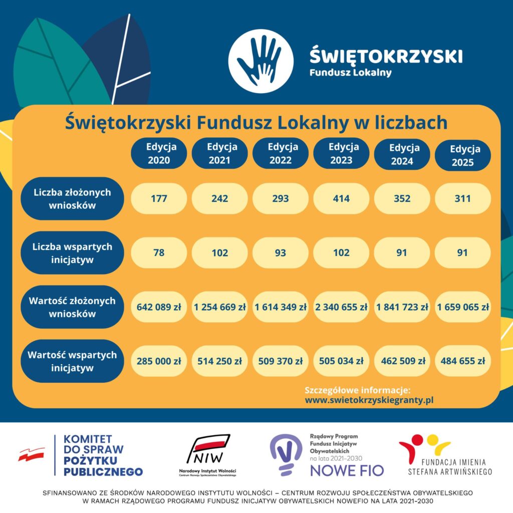 W ramach piątej edycji Świętokrzyskiego Funduszu Lokalnego dofinansowano 91 inicjatyw na kwotę ponad 484 tys. zł. W przypadku młodych organizacji wsparcie finansowe wynosiło od 2 000 do 6 000 zł, natomiast dla grup nieformalnych od 2 000 do 5 000 zł. Łącznie do społeczników z województwa świętokrzyskiego trafiło już ponad 1,8 mln zł – informuje Kamil Kołbuc, prezes Fundacji im. Stefana Artwińskiego.