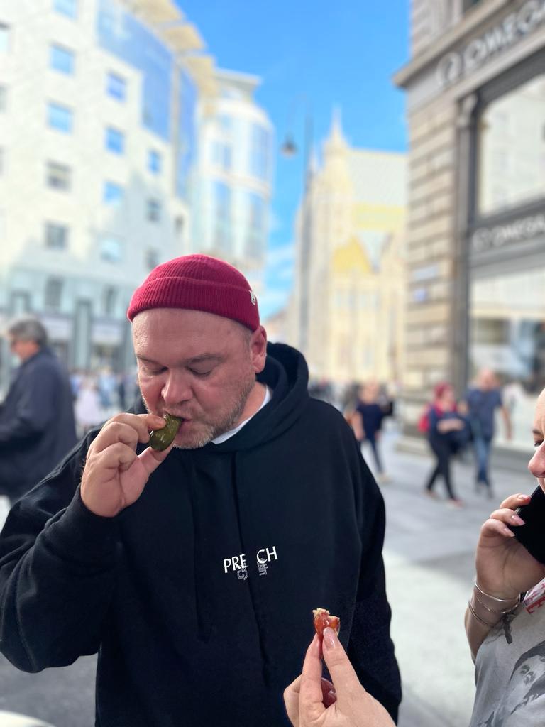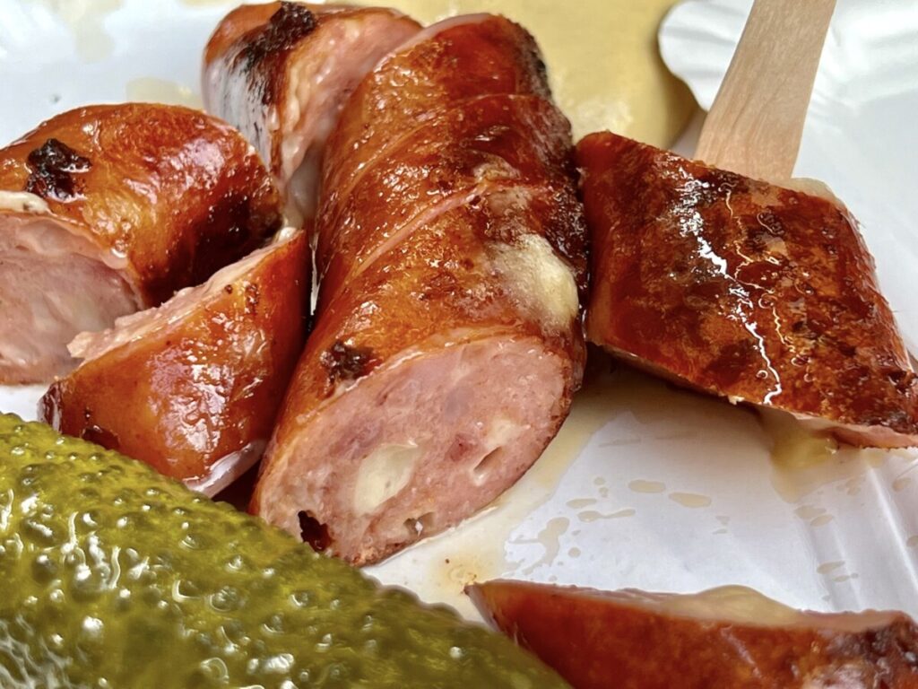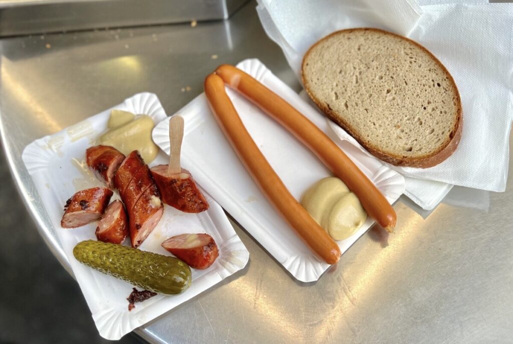 Zacznijmy więc od ulicznego jedzenia. Niemal na każdym rogu Starówki zjemy oczywiście kiełbaski. Wursty są tu tak popularne, jak u nas kebaby. Szybka, uliczna przekąska, tania i smaczna. Pikle (ogórek, kapusta, pikantne papryczki) płatne osobno. Wzięliśmy klasyczne wienerki z chlebem i musztardą (2 sztuki w zestawie) oraz wursta z serem, do którego dobrałem kiszonego ogórka.