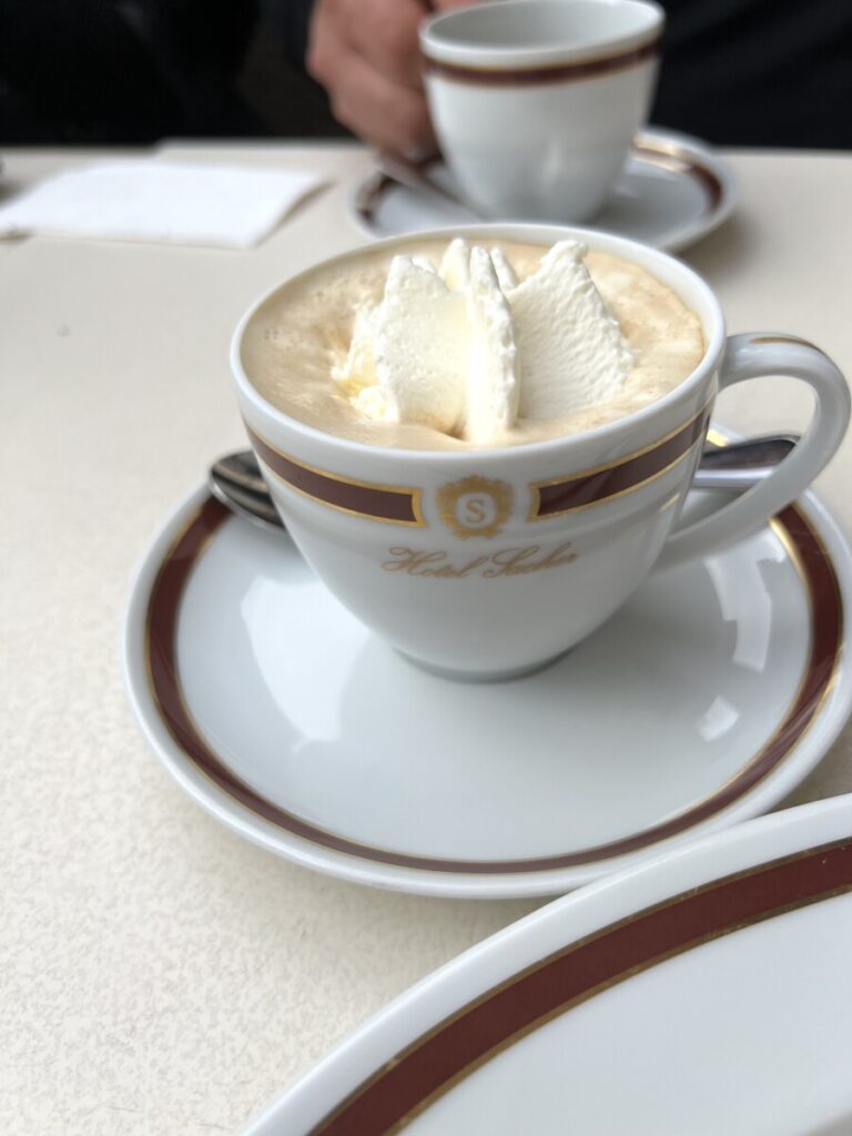 Po odstaniu kilkunastu minut w kolejce (lepiej zrobić wcześniej rezerwację) udało nam się zasiąść wreszcie w ogródku z widokiem na piękne kamienice. Zamówiliśmy kawę po wiedeńsku (melange), herbatę Royal Earl Grey, tort i apfelstrudel.