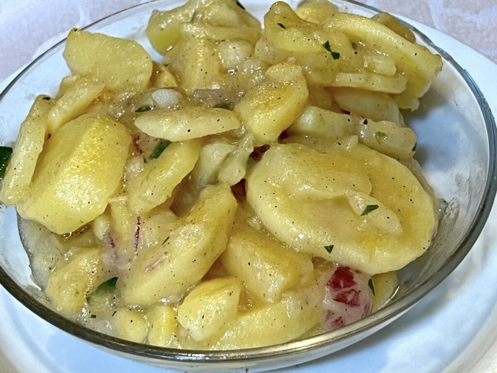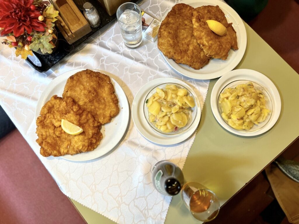 … a następnie na stół wjechały cielęce sznycle i sałatki ziemniaczane. Porcja (2 sztuki) sznycli kosztuje tutaj 12.50 euro. Niedrogo, biorąc pod uwagę, że jemy świetną cielęcinę, a także wielkość porcji.