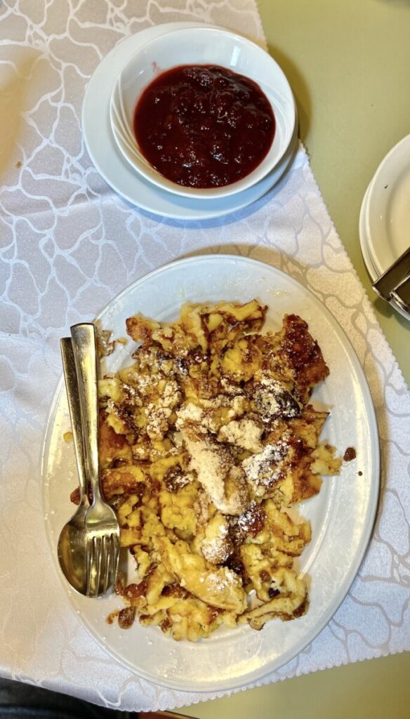 Na deser wzięliśmy kolejny austriacki klasyk, wpisany na ministerialną listę produktów tradycyjnych – kaiserschmarrn (16 euro). Jest to omlet, który w trakcie smażenia rwie się na kawałki i podaje posypany cukrem pudrem w towarzystwie gorącej konfitury, najczęściej wiśniowej lub śliwkowej. Co ciekawe, kaiserschmarrt jada się tutaj zarówno jako deser, jak i danie główne. W obu wersjach sprawdzi się idealnie, a wyrzut endorfin gwarantowany! Porcja była tak ogromna, że przyniesiono nam do niej talerzyki i spokojnie starczyło dla czterech osób.